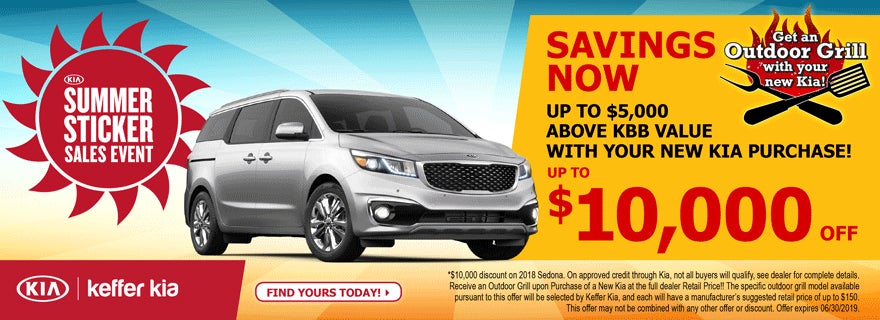 The KIA Summer Sticker Sales Event brings hot savings on new KIAs to Mooresville, North Carolina. Qualified buyers can even get an outdoor grill with your new KIA purchase! Contact Keffer KIA serving Mooresville, North Carolina for more information and save!